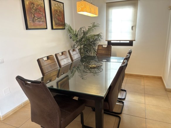 The dining room is inviting and spacious with seating for 8 people. A stylish modern kitchen with everything you would need. The kitchen leads out to the upper terrace. Where you can sit back, relax and enjoy postcard panoramic sea views.